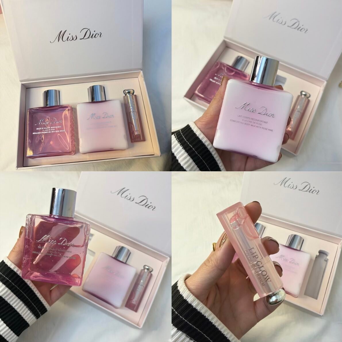 The set includes a Miss Dior Moisturizing Body Milk, enriched with rose water to hydrate and smooth the skin while leaving it feeling fresh and comfortable. Completing the set is a Miss Dior Lip Gloss, delivering a subtle shine and nourishing care for soft, glossy lips.