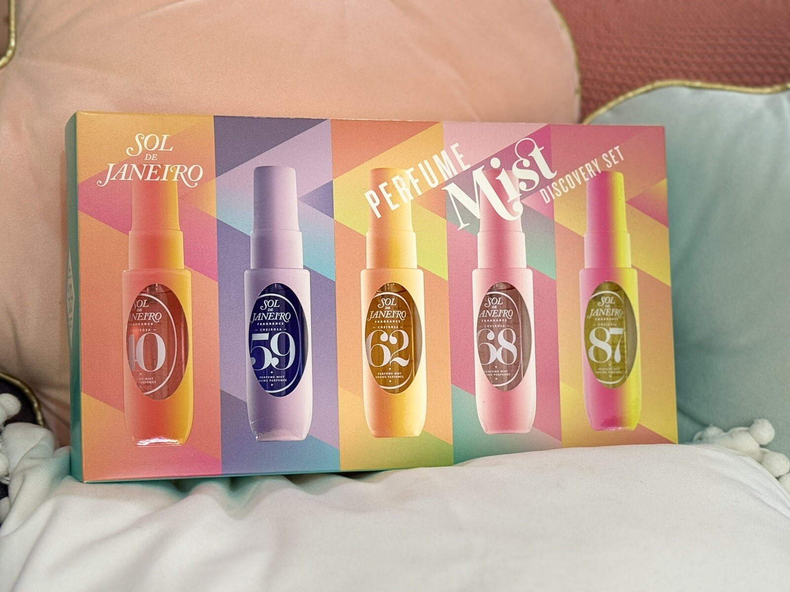 A colorful Sol de Janeiro fragrance mist set featuring five mini sprays displayed in a sleek white tray. Each bottle showcases a different vibrant scent, making the set perfect for sampling, gifting, or travel, all photographed on a clean white background for a fresh, modern look.