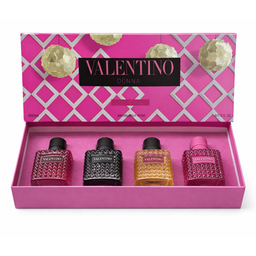 Presented in a vibrant pink Valentino gift box, this miniature fragrance set showcases four iconic studded glass bottles arranged in a luxurious velvet-lined interior. The box features a chic geometric pattern and elegant branding, creating a bold and feminine look. Each bottle is finished with a sleek cap and contains richly colored fragrance, making the set visually striking and perfect for gifting or display. A premium collector’s set that highlights Valentino’s signature design and sophisticated style.